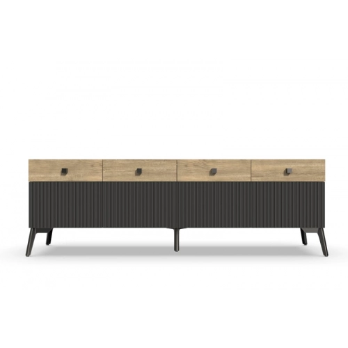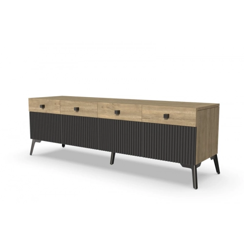 Тумба под ТВ Темпо от фабрики Geona - это красивое и практичное решение для тех, кто ценит качество и удобство. Она выполнена с использованием рифлёных поверхностей в двух цветах - Дуб Галифакс натур. 8177 и Софт блэк.